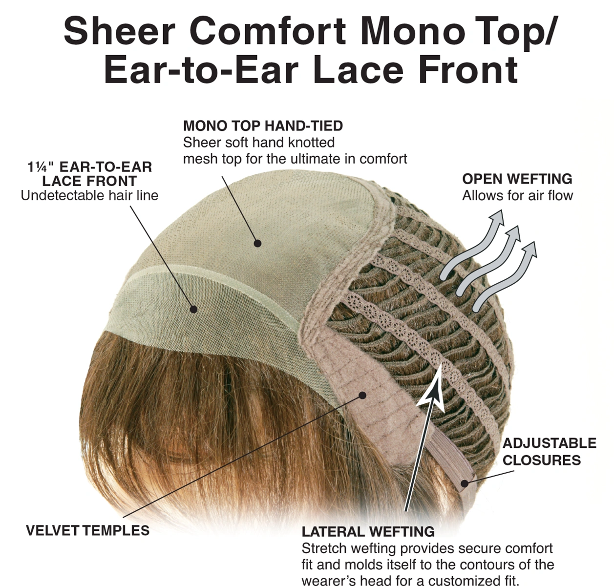 Sheer Comfort cap with a hand knotted soft monofilament mesh and ear to ear lace front designed for an undetectable hair line. All day, everyday comfort and the styling versatility to brush back off the face and even pull your hair into a ponytail.