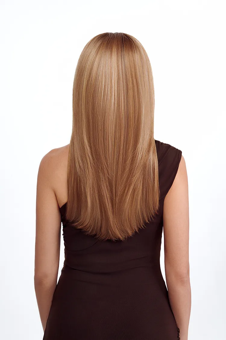 Handcrafted with Realistic Light Fiber, a proprietary blend that mimics the look and feel of fine human hair, this wig delivers a natural, undetectable appearance. The sleek, feathered layers taper beautifully, falling gracefully to the mid-back for a modern silhouette, while soft, face-framing curtain bangs seamlessly graduate into the tapered layers.